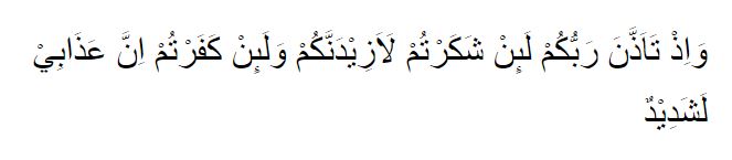Dan (ingatlah juga) tatkala Tuhan kalian memaklumatkan, “Sesungguhnya jika kalian bersyukur, pasti Kami akan menambah (nikmat) kepada kalian; dan jika kalian mengingkari (nikmat-Ku), maka sesungguhnya azab-Ku sangat pedih.” (Q.S. Ibrahim ayat 7)